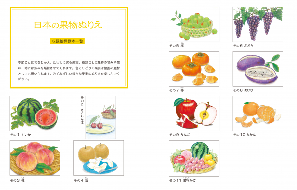 人気が高くまた馴染みの深いラインナップで、幅広い年齢の方に楽しんでいただけるセレクトとなっています。また10種類をすべて盛り合わせたスペシャルバージョンが最後についています。それぞれのページは切り離し可能なので、塗ったあと飾ることも可能です!