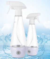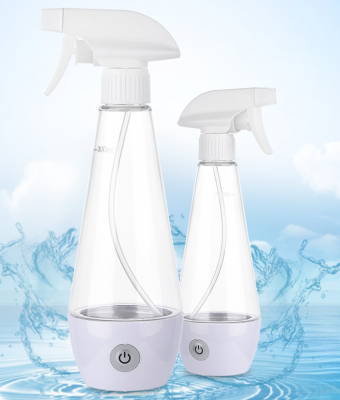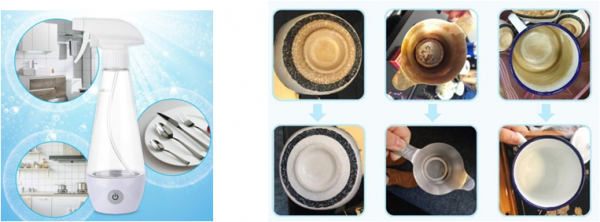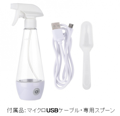 本体に300mlの水と塩を付属のスプーンですりきり1杯入れ、生成ボタンを押すと8分で次亜塩素酸水が簡単に出来ます。出来あがったらそのままスプレーで噴霧出来るので、別容器も必要なし。お手軽かつ経済的に様々な場所の除菌や食器の着色汚れを落とす事が出来ます。