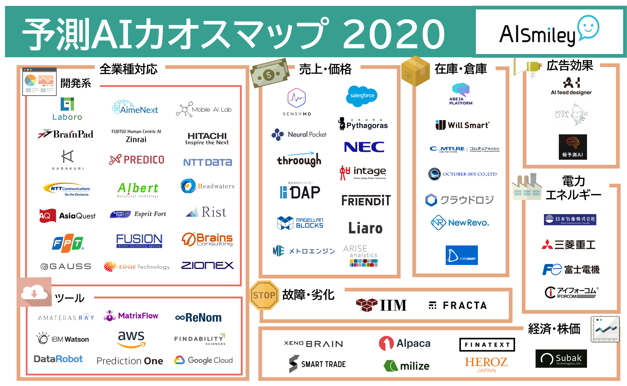 ※このカオスマップは予測AIを提供している企業のプレスリリースや製品サイト、導入実績などの公開情報を基にAIsmiley編集部が独自の主点で取りまとめたもので、網羅性や正確性を完全に担保するものではありません。