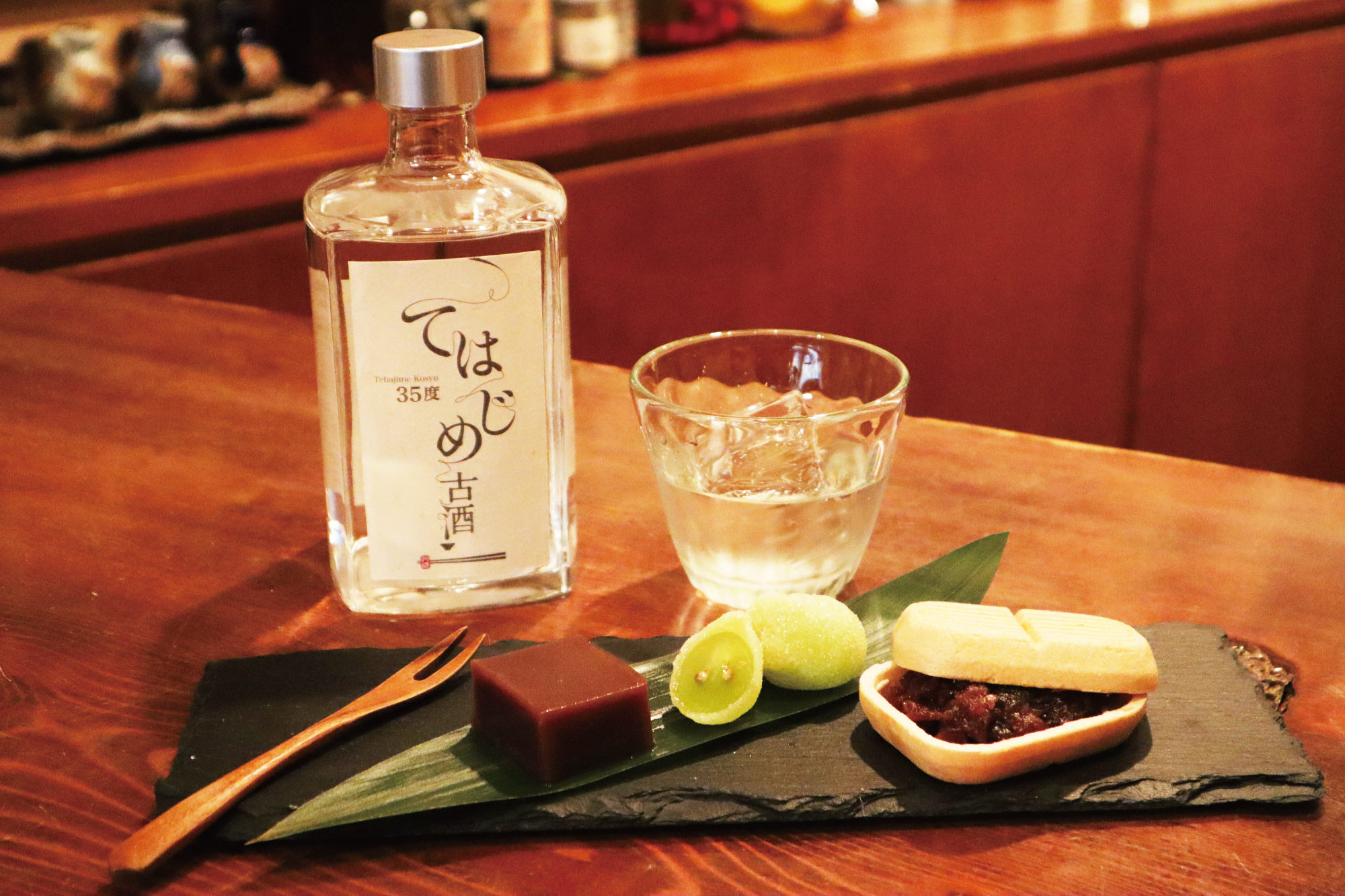 氷を入れ、ゆっくり溶かしながら楽しむと、古酒の旨み・コクを楽しめる最高の食後酒に。ウイスキーをチョコレートで楽しむように、和菓子で古酒を楽しむのが大人の楽しみ方。オススメはパリッとした口当たりが心地よい、こしあんとモナカ。氷が溶けて口の中の水分を絶妙に補い、優しいあんこの甘さと、古酒の深い旨みが合わさり、食後のデザートとしては最高です。