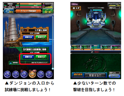 「古代魔導士の試練場」は、全6階層のダンジョンです。全ての階層にボスが出現し、ミッションクリアや宝箱などから、倒したボスのカードを稀に入手することができます。また、倒すのにかかった合計ターン数が表示され、それに応じた称号をもらうことができます。