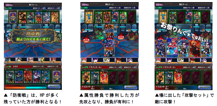 バトルは、基本的に3ターンで決着をつけます。「殲滅戦」と「防衛戦」に関しては、3ターンで決着がつかなかった場合(全て引き分け、またはBPが同じだった場合)、勝利条件を満たすまでバトルを行なうサドンデスモードに入ります。