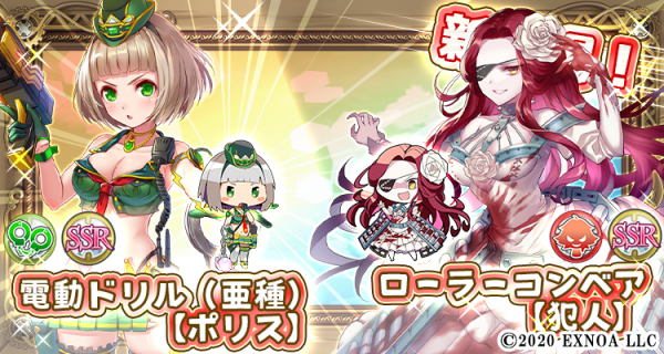 犯人(赤)属性期間限定SSR「ローラーコンベア【犯人】」、ポリス(緑)属性期間限定SSR電動ドリル(亜種)【ポリス】」が金ガチャに登場!