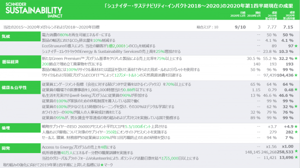 エネルギーマネジメントおよびオートメーションにおけるデジタルトランスフォーメーションのリーダーであるシュナイダーエレクトリックは、6年目となる2020年第1四半期の同社の決算資料および決算補足資料を本日発表しました。シュナイダーエレクトリックは各四半期にシュナイダー・サステナビリティ・インパクト(SSI)の21の指標を公表し、2018年から2020年までの持続可能性に向けた積極的な取り組みの進捗を評価しています。これは、COP21および国連の持続可能な開発目標(SDGs)に沿ったものです。2020年第1四半期のシュナイダー・サステナビリティ・インパクトのスコアは、現在の危機による停滞が予想されたとおり、7.15/10となりました。シュナイダーエレクトリックグループは、全世界における社会経済的および経済的な責務を確認し、さらなる措置を展開しました。