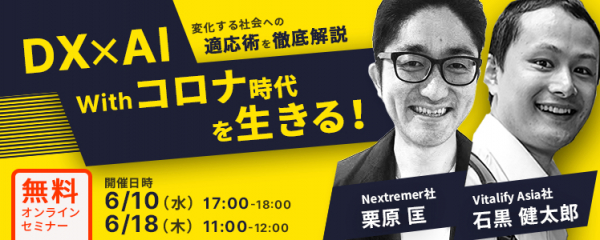 ベトナムオフショア開発を行うバイタリフィ(本社:東京都渋谷区、代表取締役:川勝潤治)と子会社Vitalify Asia(本社:ベトナム国ホーチミン市、代表:櫻井岳幸)、Nextremer(本社:東京都板橋区、代表取締役社長 CEO:高橋太一)は、6月10日(水)と6月18日(木)に無料ウェビナー『DX × AI withコロナ時代を生きる!変化する社会への適応術を徹底解説』を開催します。