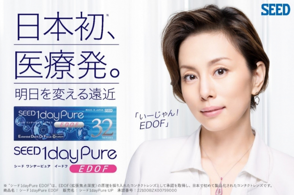 女優の米倉涼子さんがイメージキャラクターを務める「シード1dayPure EDOF(イードフ)」は、白内障手術で使う眼内レンズなど医療分野で利用されているEDOF(イードフ・拡張焦点深度)の原理を採り入れたコンタクトレンズとして承認を取得し日本で初めて製品化した、遠近両用1日使い捨てソフトコンタクトレンズです。日本を中心に、デンマーク、オランダ、香港、オーストラリア等において製品展開しており、国内外の幅広いお客様にご好評をいただいております。
