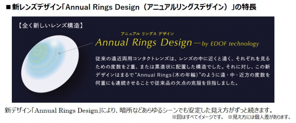 EDOFとは、Extended Depth Of Focus(拡張焦点深度)の略で、従来とは異なるレンズデザインにより、焦点深度と呼ばれる、“焦点(ピント)が合っている”と認識できる範囲を拡げることをいいます。白内障手術で使う眼内レンズなど医療分野で既に利用されているこの原理を採り入れた、まったく新しいレンズデザイン「Annual Rings Design(アニュアルリングスデザイン)」により、様々な環境下においても安定した見え方が期待できることが、「シード1dayPure EDOF」の特長です。老視の進行度に合わせ、拡張焦点深度のレンズパターンLow(低)、Middle(中)、High(高)の3段階用意しているため、幅広いニーズへの対応が可能です。