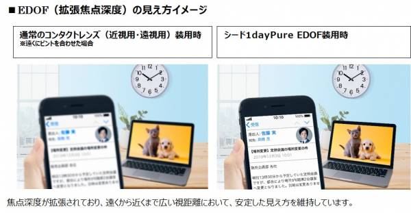 「シード1dayPure EDOF」は、光学特性(レンズ性能)と視覚特性(人の見る力)を最大限に引き出せるアルゴリズムを用いてレンズデザインを設計し製品化したEDOF遠近両用コンタクトレンズです。