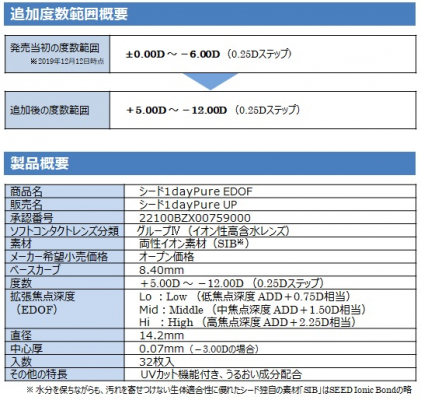 株式会社シード(本社:東京都文京区、代表取締役社長:浦壁 昌広、東証1部:7743)はオーストラリアの世界的研究機関であるBrien Holden Vision Institute(ブライアンホールデン視覚研究所、BHVI)との共同開発により発売した、日本初・医療発の遠近両用1日使い捨てソフトコンタクトレンズ「シード1dayPure EDOF(イードフ)」の球面度数を2020年6月1日より順次拡大いたします。