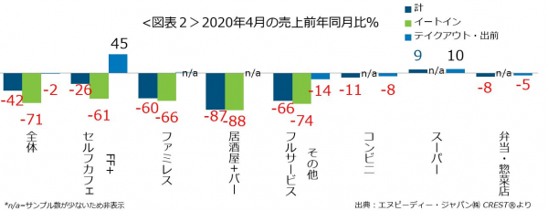 外食・中食市場全体の2020年4月の前年同月比(図表1)をみると、売上(金額市場規模)が41.9%減少、客数(食機会数)が26.5%減少しました。内訳として、外食(購入場所で喫食。コンビニやスーパーなどのイートイン含む)売上は71.2%減少、客数(食機会数)は64.0%減少しました。