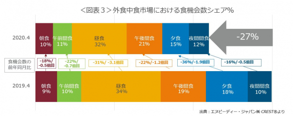 食機会別の食機会数シェアの変化と前年同月比をみると(図表3)、もっとも食機会数が減少したのは昼食(約3.1億回減)で、前年同期比は31%減でした。夕食が次に減少が大きく(約1.9億回減)で、同36%減でした。
