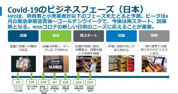 エヌピーディー・ジャパン フードサービスシニアアナリストである、東さやか(あずま・さやか)は、次のように話します。「外食市場において、4月の緊急事態宣言後~ゴールデンウイークがコロナウィルス感染拡大の影響を最も受けたピーク期であり、5月の連休後は、“再スタート”の時期となります。今後は、“回復”期に向かいますが、Withコロナの新しい日常のニーズに応えることが重要となります。ウィズコロナの新しい生活様式に合わせた、長期戦をみすえたサービスが増加を続けると考えられ、テイクアウトやデリバリーは、今後も伸びが続くと予想されます。」