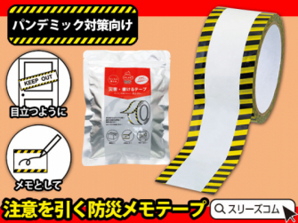 こうした中、スリーズコムで運営する記念品ストアーにて、2020年6月3日より、新商品として「注意喚起メモガムテープ。ソーシャルディスタンス向け」を発売します。現在在庫は9000個あり、大口の依頼も対応可能です。