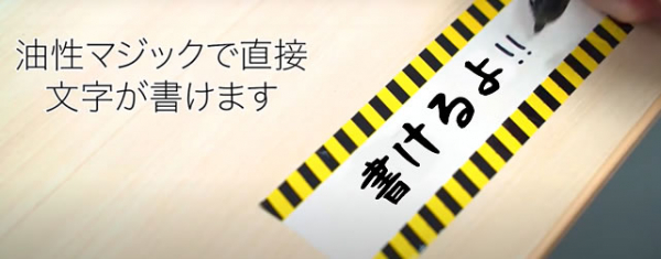 特徴:黄色・黒帯が上下にあり、真ん中の白い部分に、油性マジックで手書きスペースがあるのが特徴