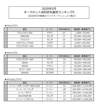 情報流通支援サービスの株式会社オークネット(本社:東京都港区/代表取締役会長CEO:藤崎 清孝 代表取締役社長COO:藤崎 慎一郎)は、2020年5月度のオークネットバイクオークションにおける成約台数を集計し、排気量別ランキングベスト5をまとめました。