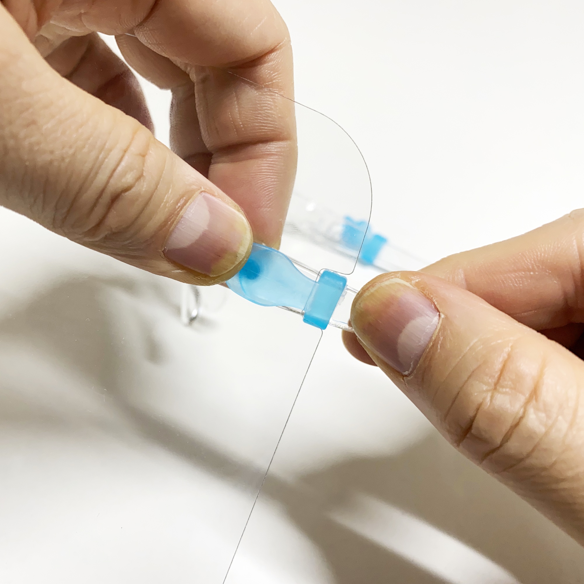 「フルフェイス・クリアシールド」はメガネ型の支持具にシールドを固定することにより、頭ではなく、鼻で支える仕組みを採用。眼鏡のようにさっと着脱でき、髪型が乱れないというメリットが生まれました。また、額を押さえないため、風通しもよく、夏も快適にお使いいただけます。