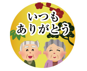 このシールは購入した商品に貼る事で、単なる記念品が「敬老会向けプレゼント品」になる魔法のシールです。昨年は「敬老の日ありがとう」と書いてあり、敬老の日しか使えないデザインでしたが、今年の2020年度版は、いつの時期でも使えるように違うデザインとしました。