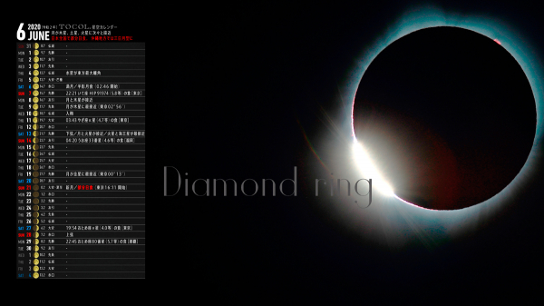 6月の壁紙は「ジューンブライド(June Bride)」にもちなんだダイヤモンドリング。皆既日食の終わりに、月の谷間からもれた太陽光が明るく輝き、太陽を取り巻く内部コロナと合わせて、まるでダイヤモンドの指輪のような姿がみられる。