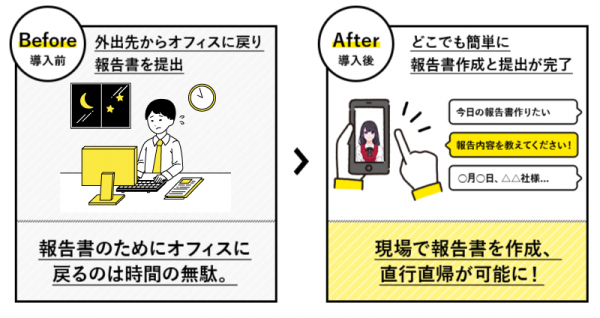 スマートフォンやノートPCを通じてAIさくらさんと会話をするだけで業務日報を作成することができるため、オフィスに戻って業務日報を作成・提出するという無駄をなくすことができます。