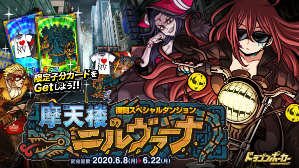 株式会社アソビズム(本社:東京都千代田区、代表取締役:大手智之)は、App Store・Google Playにて好評配信中のリアルタイム合体カードバトル『ドラゴンポーカー』で、2020年6 月8日(月)より復刻スペシャルダンジョン「摩天楼のニルヴァーナ」を開催いたします。