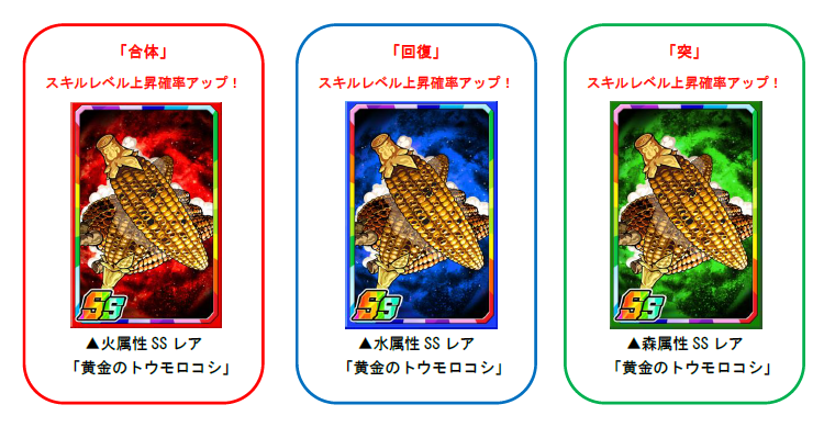 限定強化素材「黄金のトウモロコシ」は一部のモンスターに使うと強化値2倍の効果があるほか、合体スキル・回復スキル・突スキルのスキルレベル上昇確率もアップします。