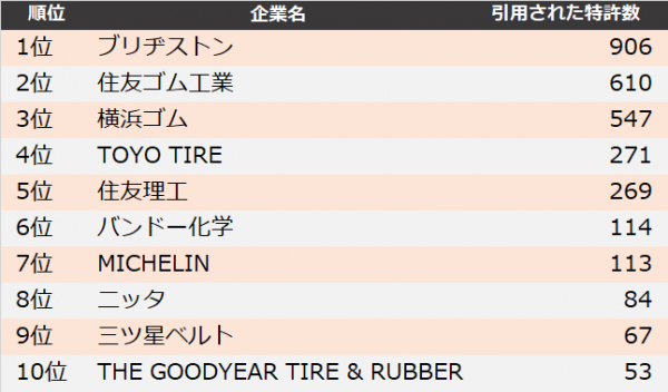 集計の結果、2019年に最も引用された企業は、ブリヂストン、次いで住友ゴム工業、横浜ゴムとなりました。