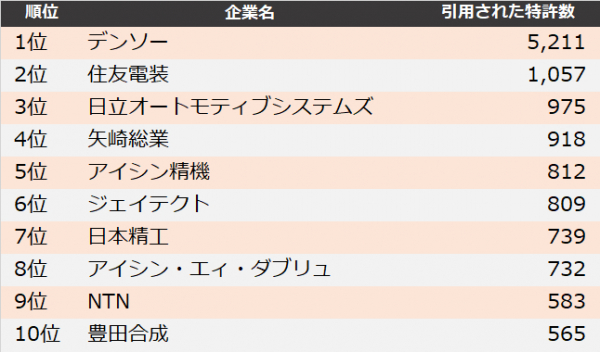 そのほか、4位の矢崎総業は「聞き逃しの可能性を減じることができる車両内の警報装置」、5位のアイシン精機は「両手が塞がっていても、選択的に開作動できる車両用開閉体作動装置」が、最も引用された特許として挙げられます。