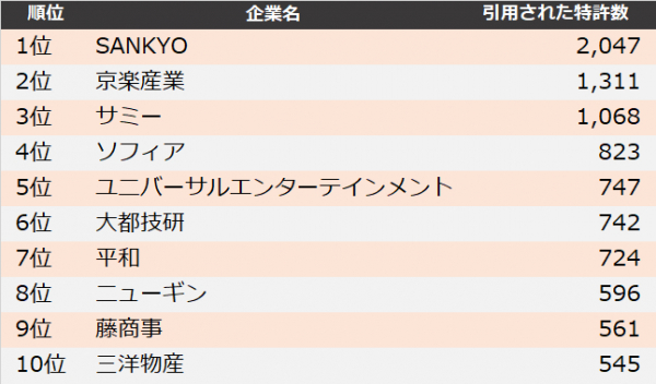 そのほか、4位のソフィアは「操作演出に継続的な興味を抱かせる遊技機」が、5位のユニバーサルエンターテインメントは「表示装置から発生する熱による弾球遊技機の故障を防止する技術」が、最も引用された特許として挙げられます。