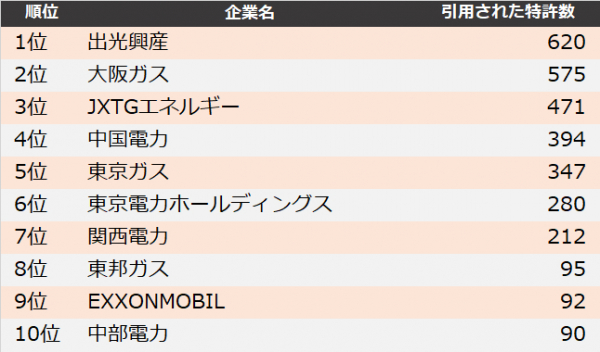 石油・エネルギー業界の被引用件数上位30社のランキング