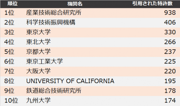 そのほか、4位の東北大学は「マルチモードファイバの測定装置」に関する技術が、5位の京都大学は「体細胞の核初期化因子」に関する技術が、最も引用された特許として挙げられます。