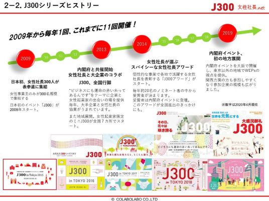 2020年10月までに、「J300地域アンバサダー」は全国各地で女性起業家向けイベント「ミニJ300」/「プレミアムミニJ300」の開催や、地元で個性的な事業を展開する女性起業家を発掘する「J300アワード」の審査等、女性起業家を応援する取り組みをJ300 実行委員会(女性社長.net内)と共に行います。