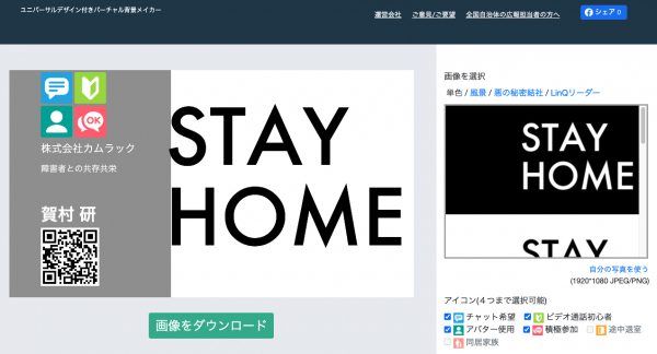 ITを活用して障害者の就労支援を行っている株式会社カムラック(本社:福岡県福岡市博多区、代表取締役:賀村研)は、株式会社イーハイブ(本社:福岡市中央区、代表取締役社長:高橋善晴)と協同で制作した「ユニバーサルアイコン付きバーチャル背景メイカー」を2020年6月15日にリリースしました。