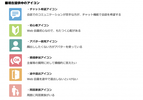 また、上記のような方がITの技術を使うことで一緒にコミュニケーションを取れるはずのウェブ会議なのですが、今までの会議や講義をそのままウェブに持ち込む方もいらっしゃいます。こういった不安要因を講師や参加者にピクトグラムのような分かりやすいアイコンで意思表示できないかと考えました。