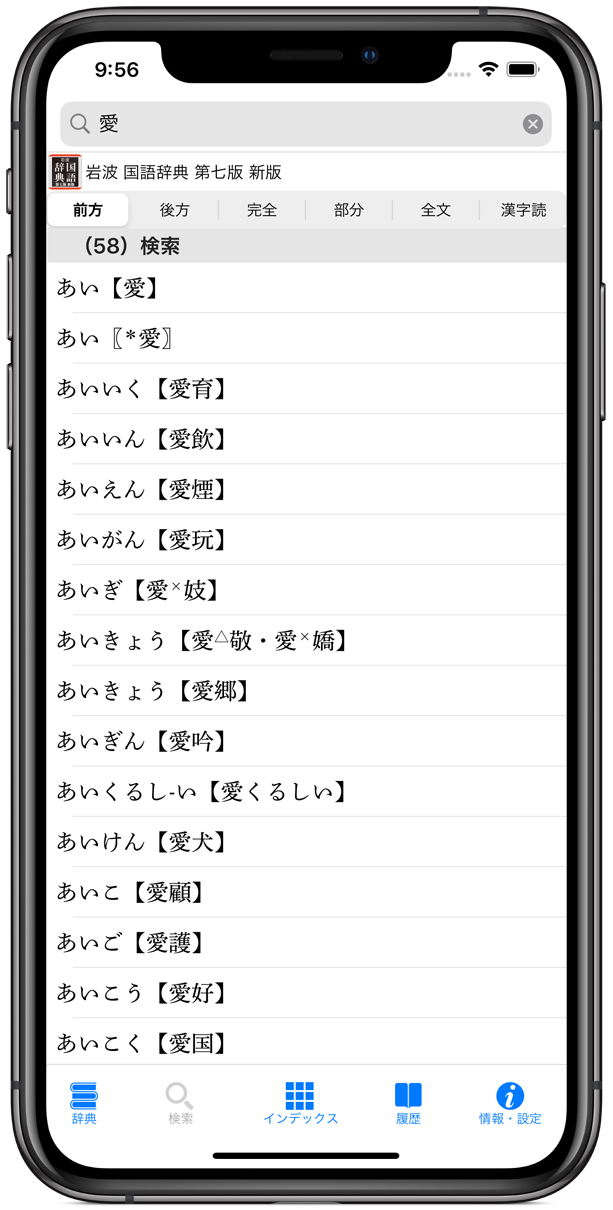 それぞれの検索方法で、文字を入力すると候補見出し語が表示されるインクリメンタルサーチに対応(漢字読検索/部分一致/全文検索を除く)