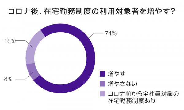 外資系企業の日本法人やグローバル化の進む大手日系企業などを含む国内企業115社の人事部に、コロナ前後のリモートワーク状況を聞いたところ、コロナ前から「全社員を対象に導入していた」企業は14%。「新型コロナ対策で新たに全社員を対象に導入した」企業は全体の73%を占めました。新型コロナ感染拡大前とその後でリモートワークを導入した企業が59ポイント増えたことが分かります。さらに、コロナ後の新しい働き方として「在宅勤務制度の対象者を増やす」と答えた企業は74%に上り、コロナ禍の影響で国内でもリモートワークの浸透・定着が加速したことを示唆します。
