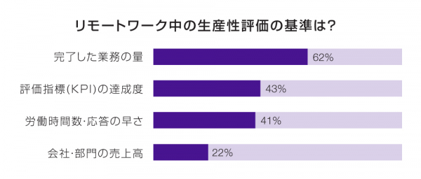 「リモートワーク期間中に従業員の生産性を計った評価基準は?」の質問に対し、115社のうち62%が「完了した業務の量」と回答。次いで、「評価指標(KPI)の達成度」(43%)、「労働時間数・応答の早さ」(41%)、「会社・部門の売上高」(22%)という結果になりました。残業による長時間労働の常態化を見直す働き方改革が進む中、コロナ禍のもとでも依然として業務量・労働時間ベースの評価が占める割合が大きいことが分かりました。同時に、回答した企業の4割で評価指標(KPI)、2割では売上高を基準に従業員の生産性を評価していたという今回の結果から、「成果主義」の浸透でも確実な進歩が見られます。