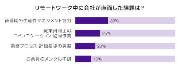 「リモートワークに際して会社が直面した課題」を聞いた質問では、1位「管理職の生産性マネジメント能力」(33%)、2位「従業員同士のコミュニケーション・協同作業」(25%)、3位「業務プロセス・評価指標の調整」(20%)という結果に。16%の企業では「従業員のメンタル不調」への対応が課題となっていたこともわかりました。管理職の能力がリモートワーク成功に直結すると考える会社が多いことが分かった一方で、管理職へのサポートとして、リモートマネジメント研修やコーチングの実施は3割を下回っています。リモートワークへの適応に際して評価指標などの調整を課題に挙げた企業が全体の20%あったうち、実際に評価指標の見直しを済ませた企業は6%に落ちていることから、評価指標・KPIの設定、引いては成果主義への移行に課題が残ることもうかがい知ることができます。