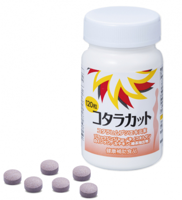 2011年に発売を開始した『コタラカット』は、自社原料のスリランカ産・コタラヒムブツエキスに、植物性キノコキトサン、白インゲン豆エキス、黒大豆種皮エキス末などを配合した飲みやすいタブレットタイプのダイエットサポート食品です。