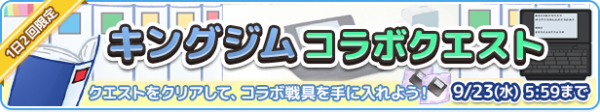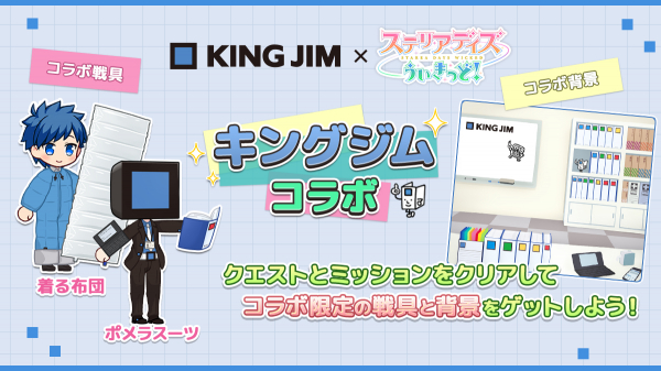 キングジムの代表商品である「キングファイル」やオフィス防災用品「着る布団」、キングジムの商品で埋め尽くされたアバター背景などを手に入れることができるコラボクエストが追加されます。