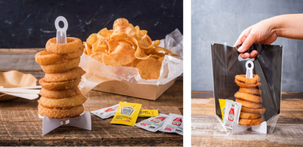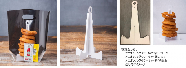 今回提供するキットは、このオニオンリングタワーの楽しさを、テイクアウトでも演出できるよう特別に開発したものです。飲食店で盛り付けて付属の透明袋に入れて渡せば、持ち帰る時からワクワク感を演出できます。また、タワーは簡単な作業で組み立てられるため、組み立て前の状態でお客様にお渡しすることも可能です。