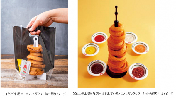 提供開始するテイクアウト用オニオンリングタワーキットは、オニオンリングをタワー状に盛り付けられるキットとテイクアウト用の袋です。