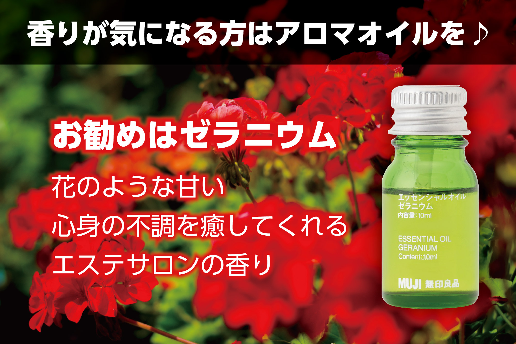 実際に社内で検証しましたが、麹(こうじ)の香りが気になる方は、無印良品のアロマオイルを数滴垂らすのがオススメです。例えば「ゼラニウム」の香りは華やかで甘い花の香りに変わり、麹の香りが気にならなくなります。アルコール濃度は変わらないので、消毒効果が落ちることもありません。