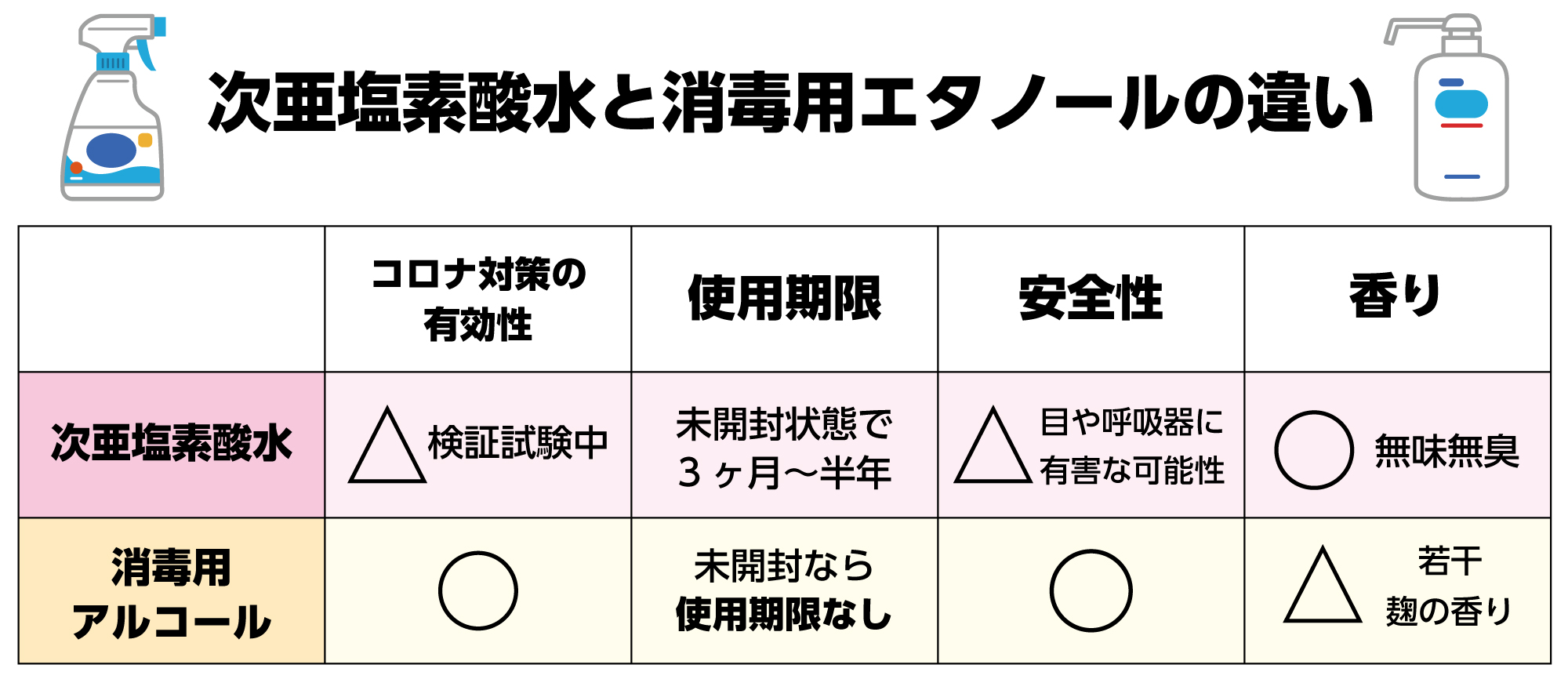 ちなみに、次亜塩素酸水と消毒用エタノールとの違いをまとめてみました(2020年6月23日現在)。