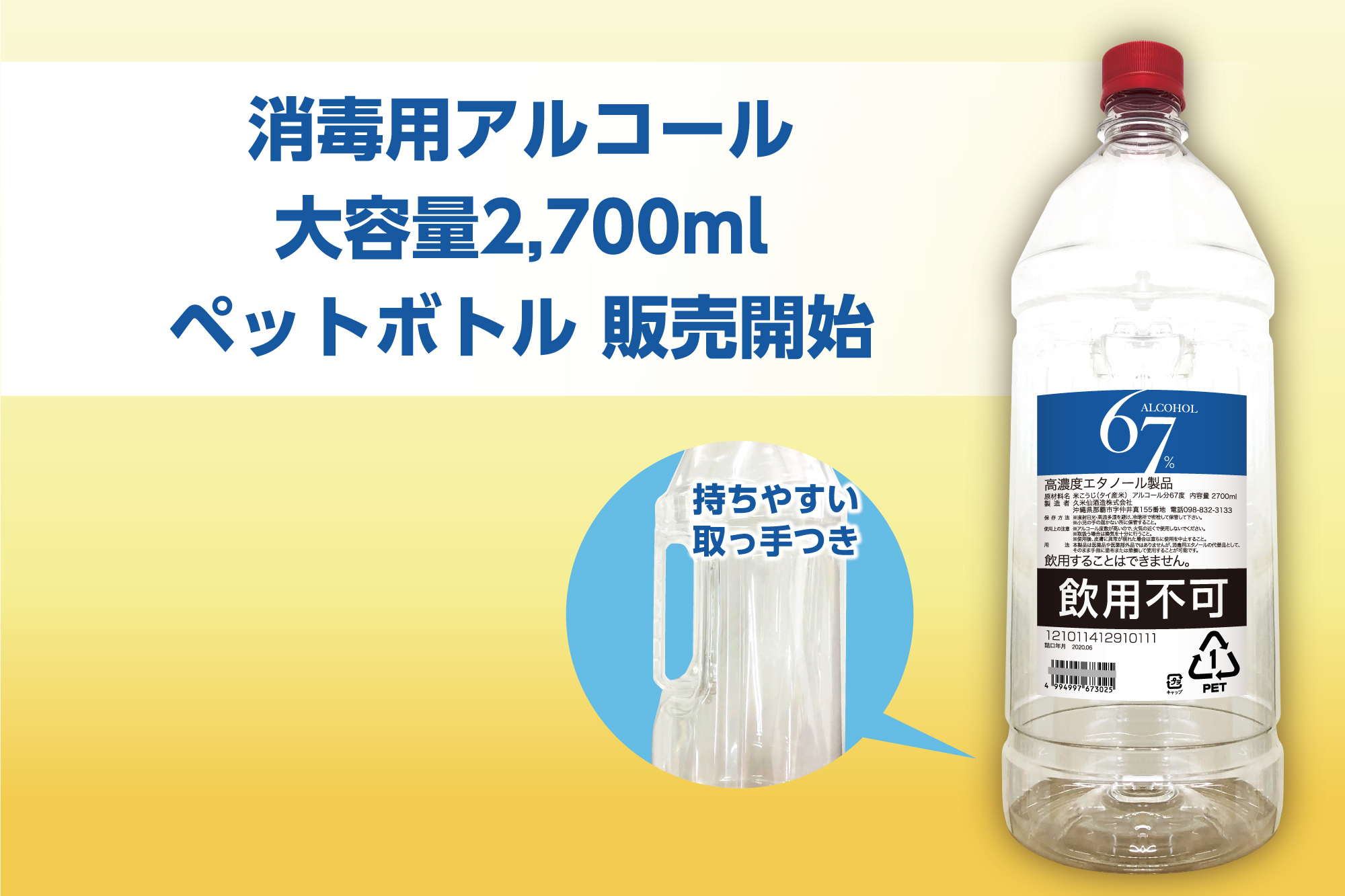 「他にもお困りの方がいるのでは?」と思い、2,700mlの大容量消毒用エタノール67度を6月12日より一般販売開始することとなりました。