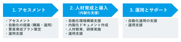 お客様のIT部門に常駐して、既存環境のアセスメントを行い、アセスメント結果にもとづき自動化の導入プラン・人材育成プランを策定します。