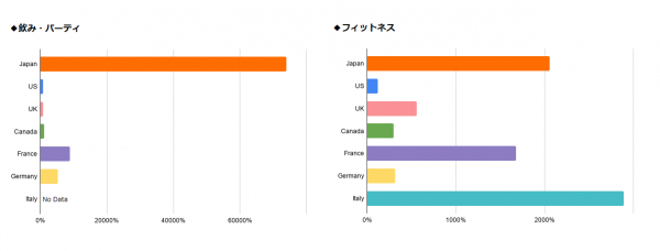 飲み・パーティ関連は、圧倒的に日本の検索増加率がトップでした。"Zoom飲み"などオンライン上で集まって飲食を共にする動きが国内で非常に盛んになったことからも、ネットで検索する人が急激に増えたことが伺えます。日本が最も検索増加率が高かったのは、日本の飲み会文化や国民性も影響している可能性や、アジア地域の感染拡大時期が欧米諸国よりも早かったことが影響している可能性もあります。最低値のアメリカでも増加率は800%を越えており、世界中で、いかにオンライン上でのコミュニケーションニーズが増えたかが伺える結果となりました。