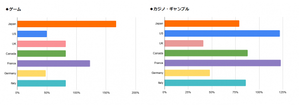 カジノやギャンブル関連ワードの検索増加率は、最大値がフランスで約120%、最小値がイギリスで約40%と、一定の需要があったことが伺えますが、増加率はそこまで高くはありませんでした。カジノやギャンブルなどは、現場の臨場感を求める人が多いのでしょうか。