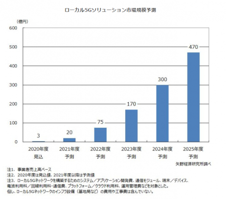 そのため、市場規模の拡大は加速し、2024年度のローカル5Gソリューション市場(事業者売上高ベース)は300億円、2025年度には470億円になると予測する。尚、2025年度の段階では、5Gを活用したIoTソリューション市場(4,550億円)の約10%が、ローカル5Gネットワークを活用したIoTソリューションシステムになる見込みである。