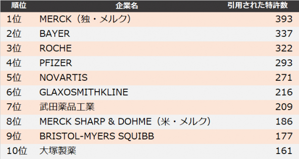日本企業では、7位に武田薬品工業(209件)、10位に大塚製薬(161件)がランクインしています。武田薬品工業の引用された件数が多い特許には「骨粗鬆症などの治療に有用なヒト副甲状腺ホルモンを含む薬学的製剤」「喘息及びCOPDをより効果的に治療する方法」などが、大塚製薬の引用された件数が多い特許には「コンディショニング効果を有する頭皮頭髪洗浄用組成物」「中枢神経疾患を治療するための組合せ薬剤」などが挙げられます。