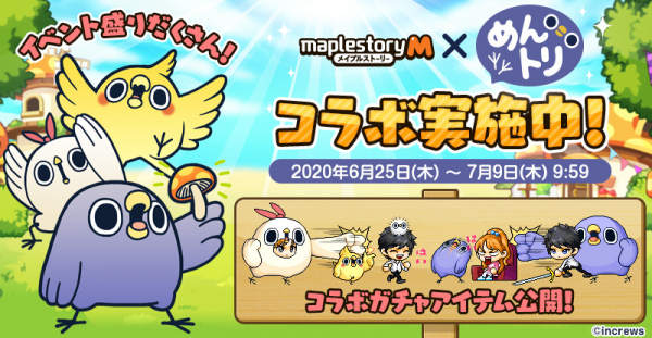 株式会社インクルーズ(東京都渋谷区、代表取締役社長 山﨑 健司)は、6月25日(木)より当社が提供するLINEスタンプ「面倒だがトリあえず返信」から生まれた「めんトリ」が、株式会社ネクソン(本社:東京都港区、代表取締役社長:OwenMahoney/オーウェン・マホニー)が企画・運営するiOS/Android向けアプリの横スクロールアクションRPG『メイプルストーリーM』と、ゲーム及びLINEスタンプにてコラボすることをご報告させていただきます。